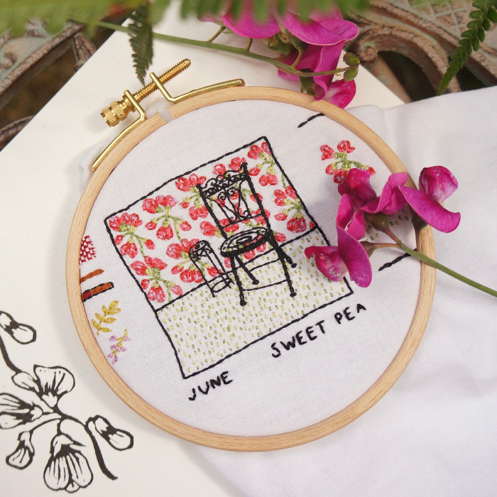 A subject matter or technique that actually excites you goes a long way in keeping you focused for longer and helps you enjoy the moments you take to switch off. For me it also gives something to focus my thoughts on while working, the challenge of a new technique, or a memory the subject matter holds. With this pattern I wanted to hold onto the beauty of the sweet pea blooms in my garden while remembering and paying tribute to the aunt who had given me this beautiful chair.